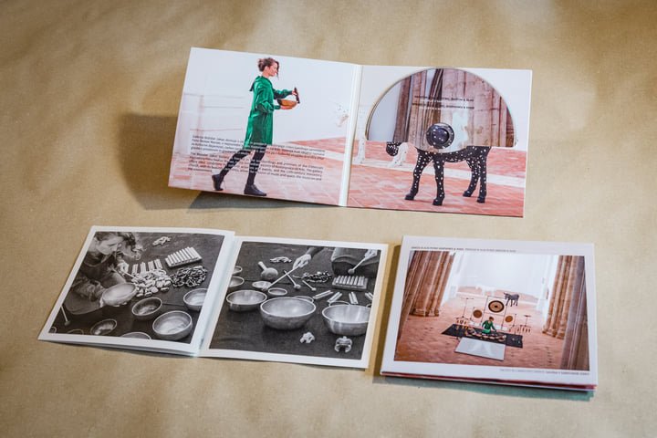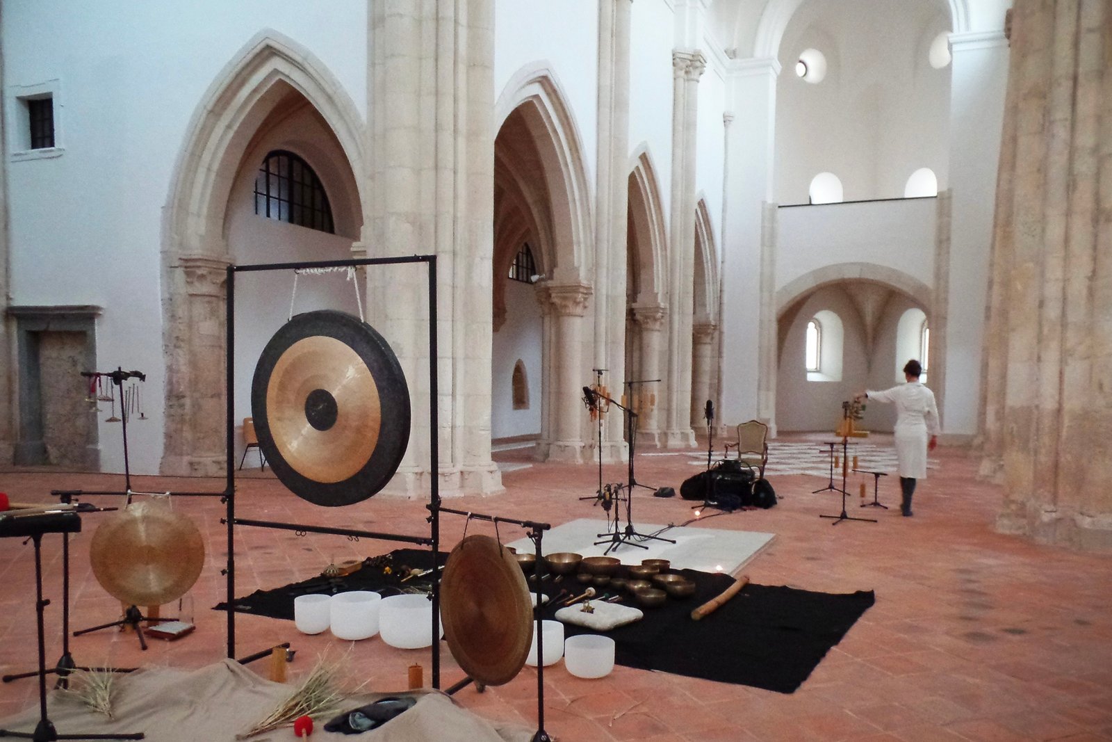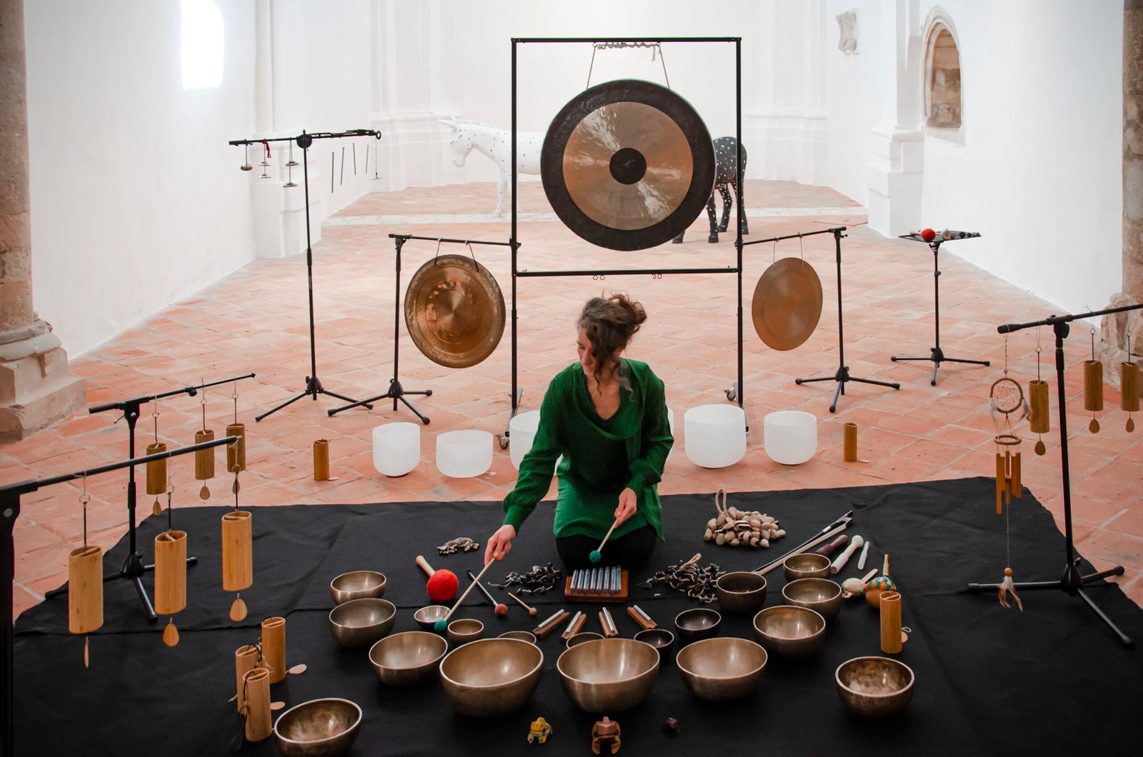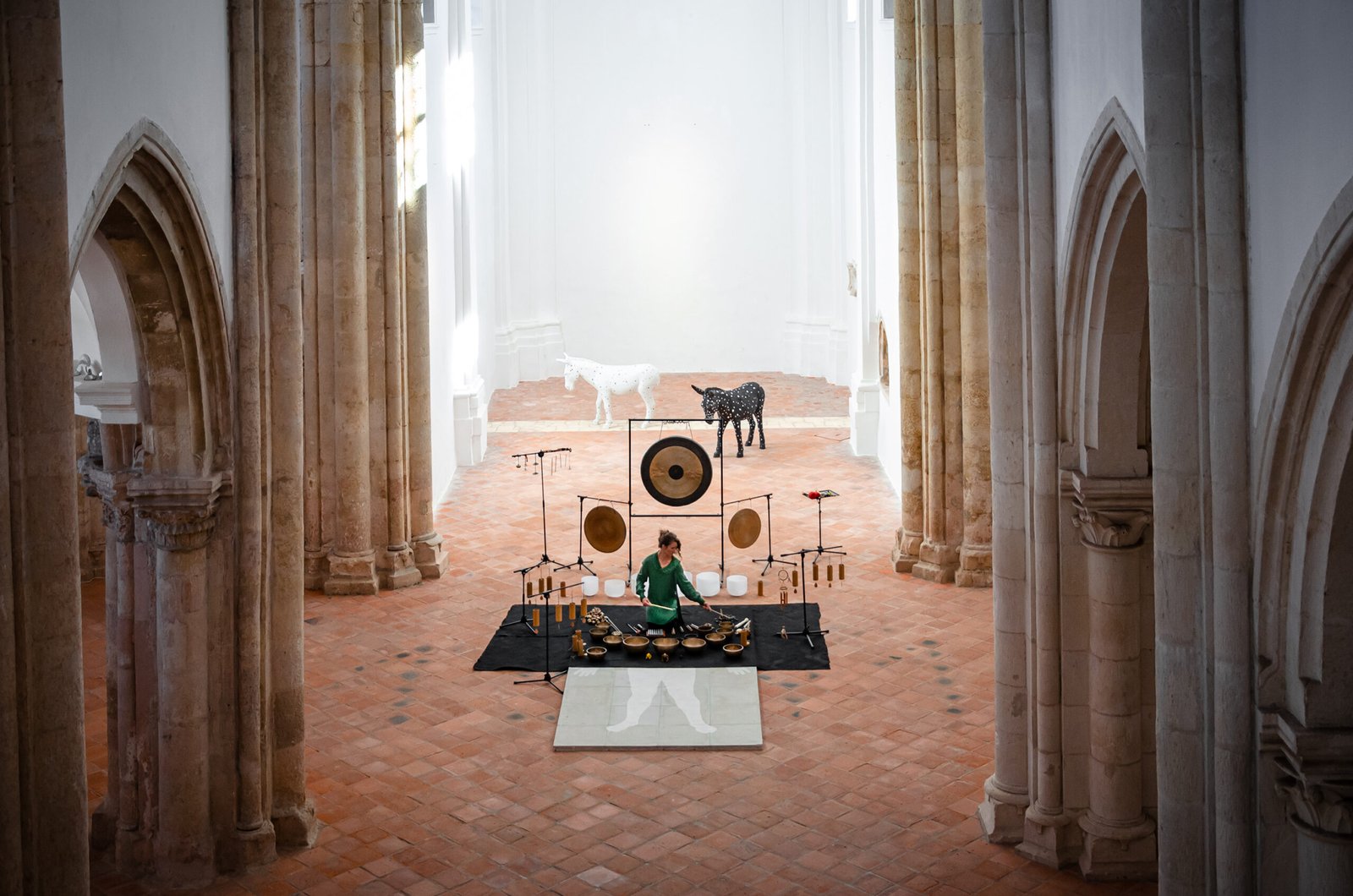 The sound material includes performances created with 15 Himalayan singing bowls, 6 crystal bowls, gongs, bells, rattles, and voice, forming an immersive acoustic experience that bridges sound installation, live performance, and architectural listening.